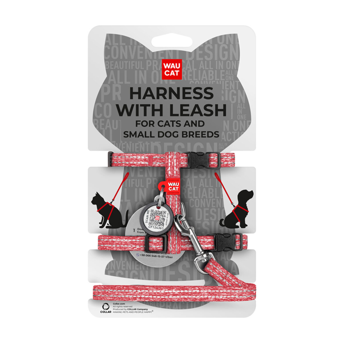 WAUCAT Re-cotton cat harness with lead with QR pet tag, reflective, plastic fastex, XS, W 3/8", L 4', B 10"-15", С 8"-11" red