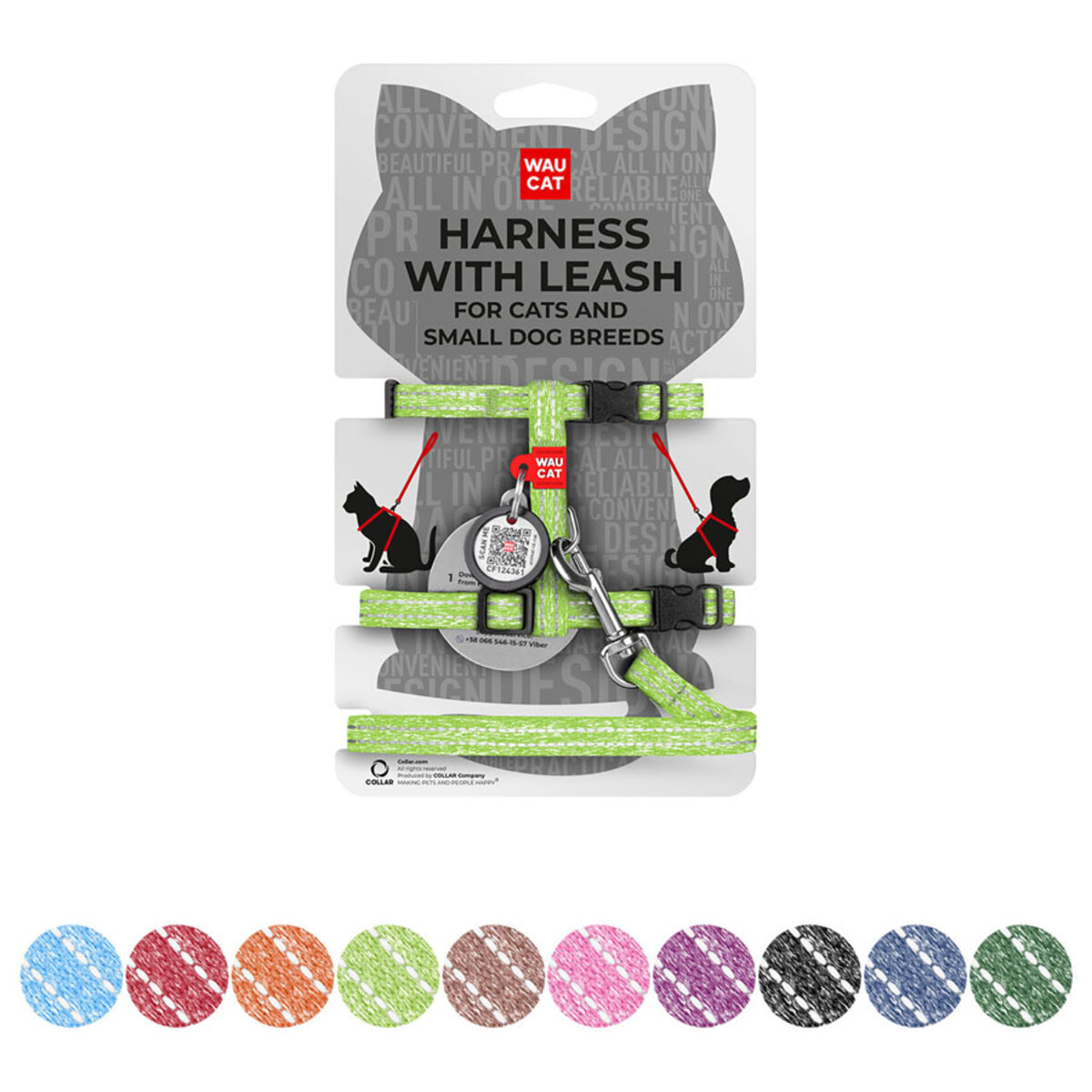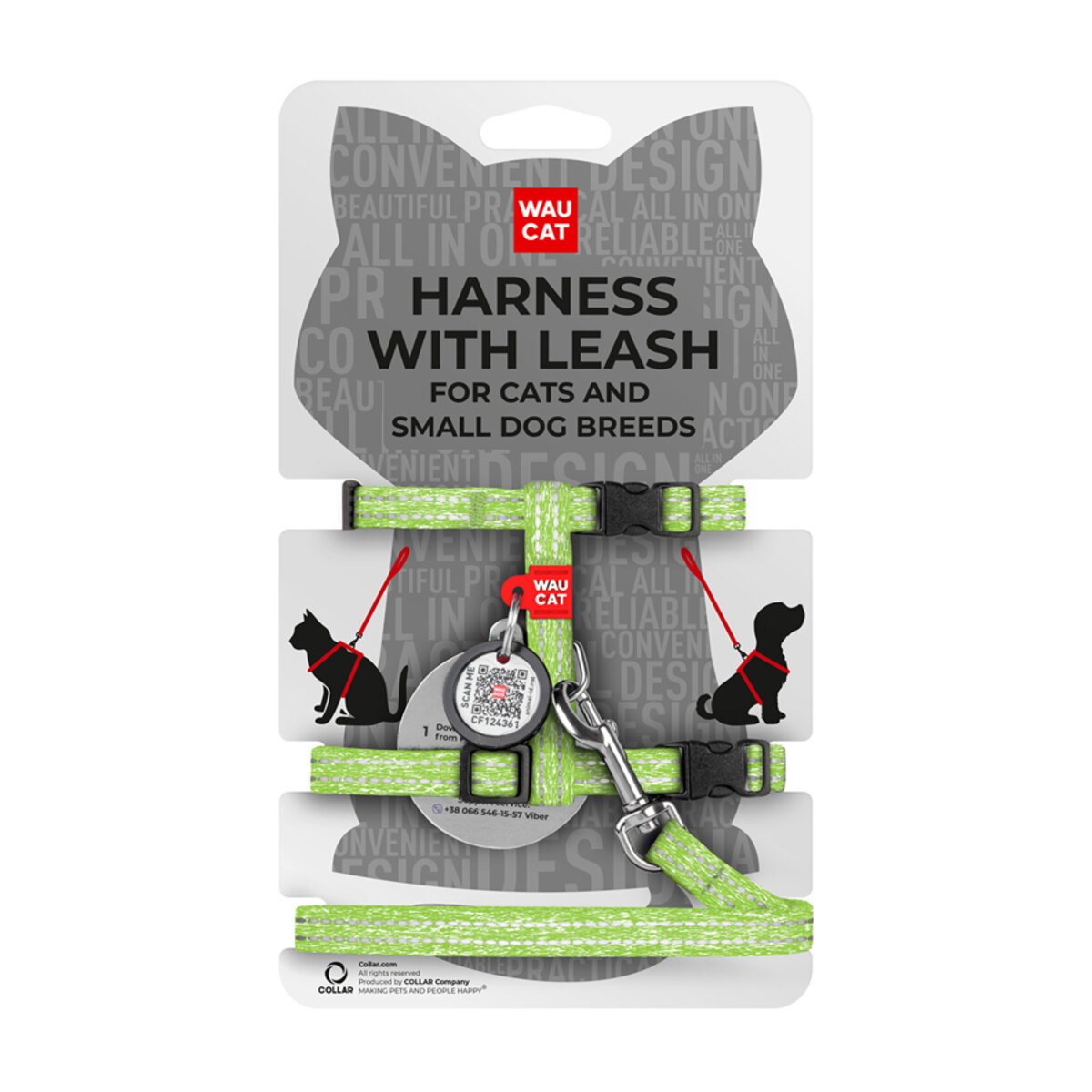 WAUCAT Re-cotton cat harness with lead with QR pet tag, reflective, plastic fastex, XS, W 3/8", L 4', B 10"-15", С 8"-11" Light green