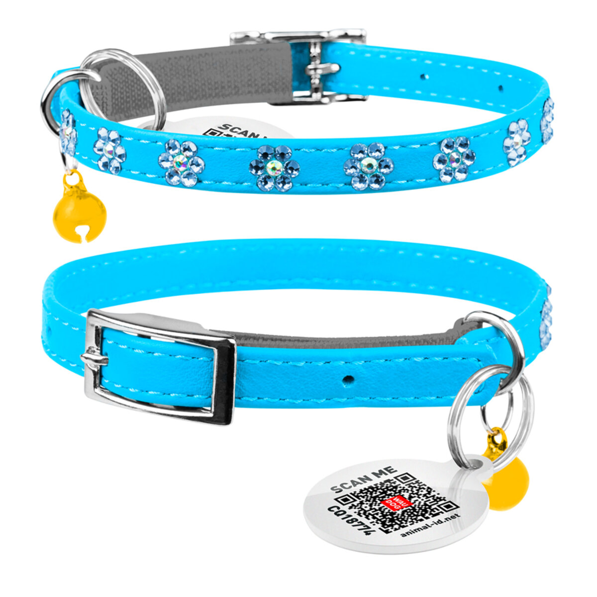 WAUCAT Glamour leather collar with rubber band and glue decorations "Flower" for cats (width 3/8", length 9"-11") Blue