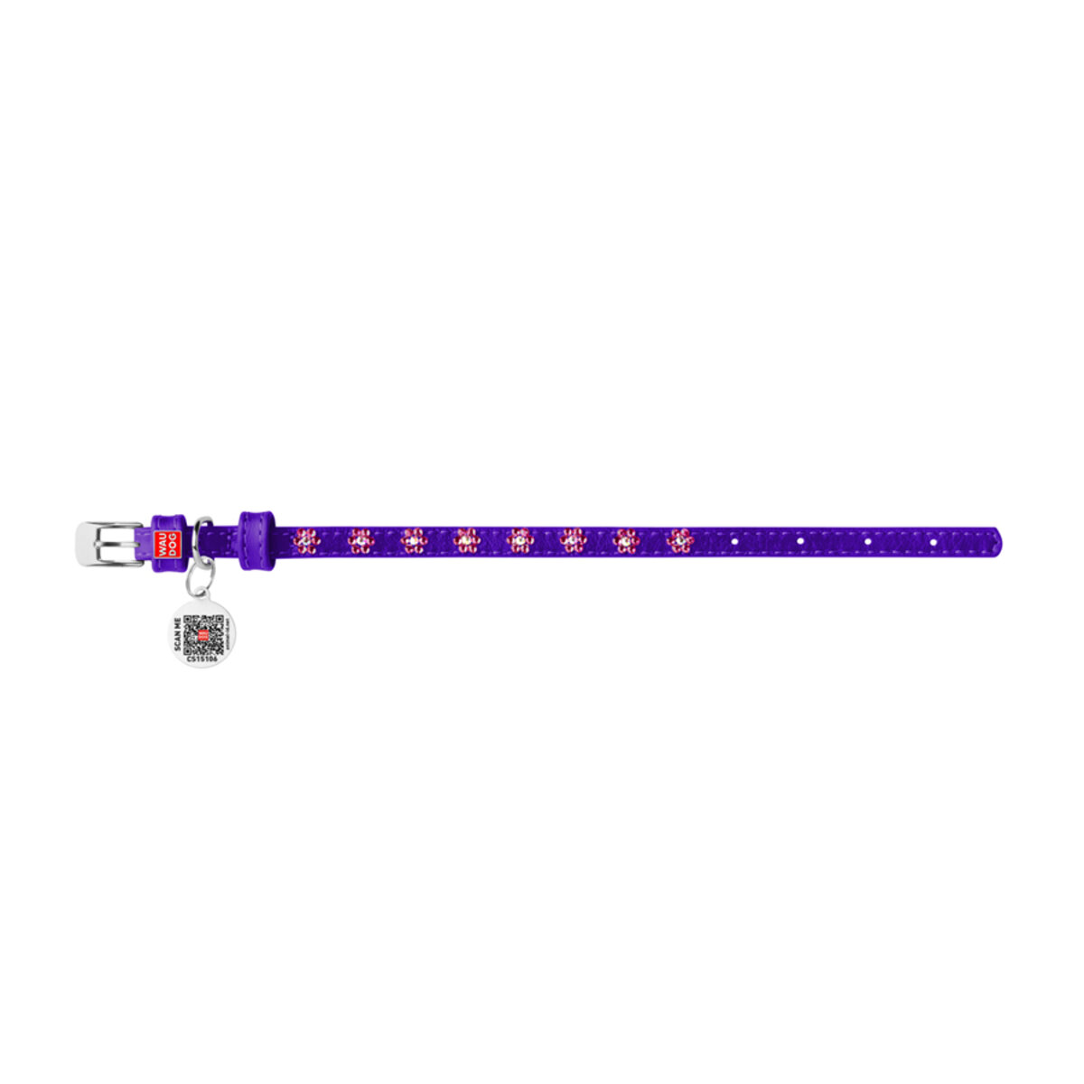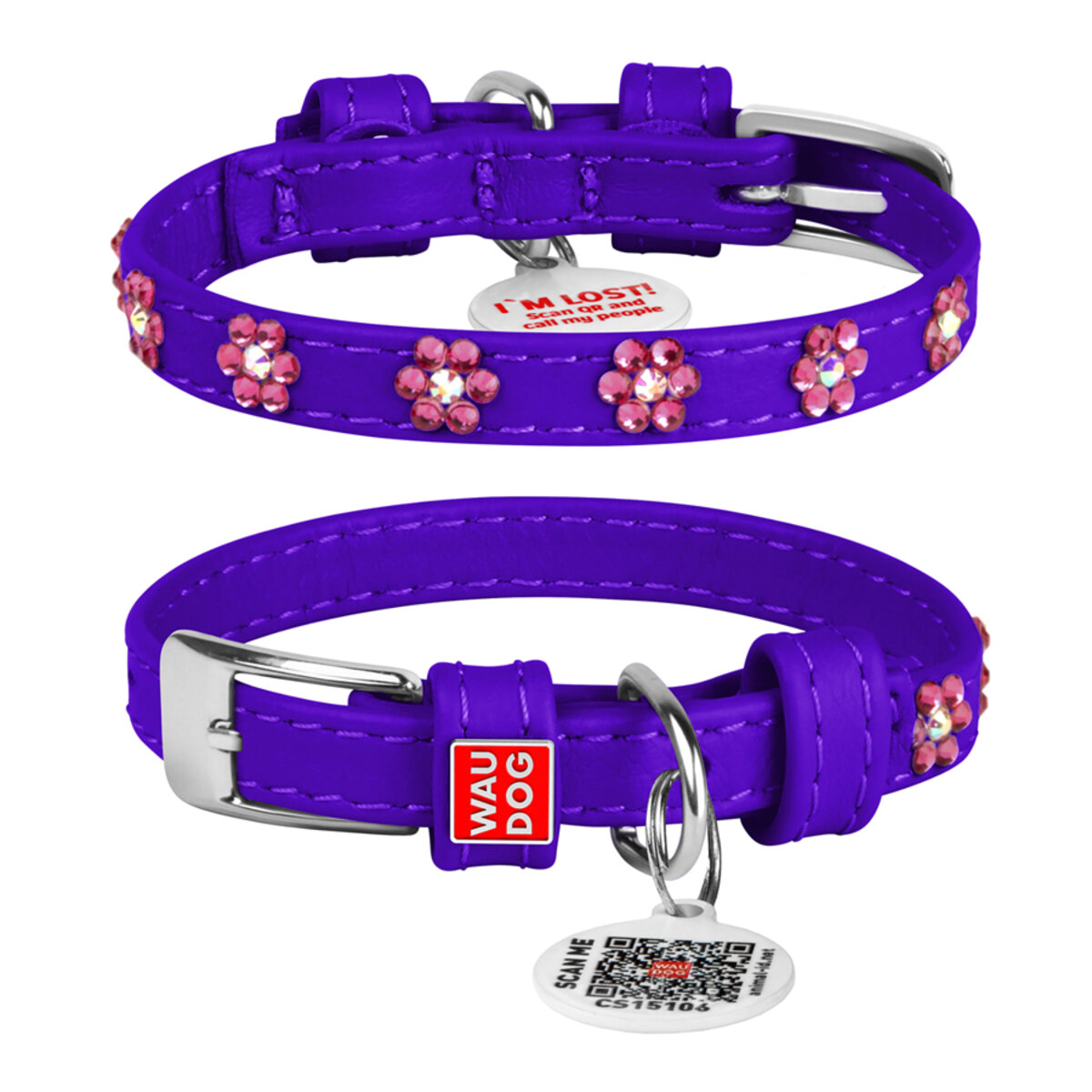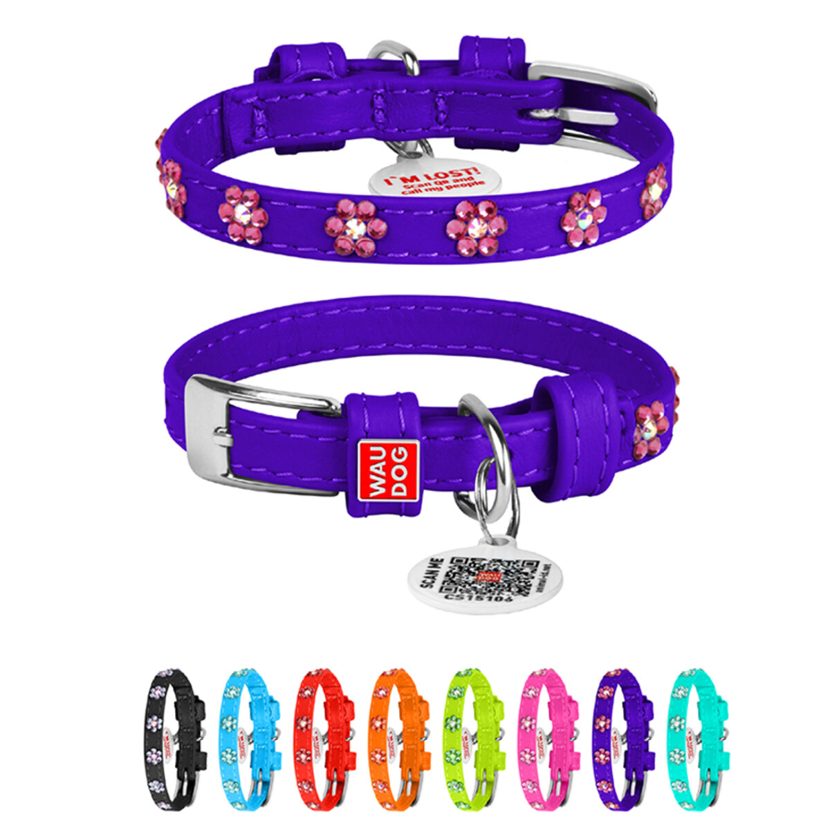 WAUDOG Glamour genuine leather dog collar with QR passport, with glued decorations "Flower", W 0.35", L 7"-8" purple