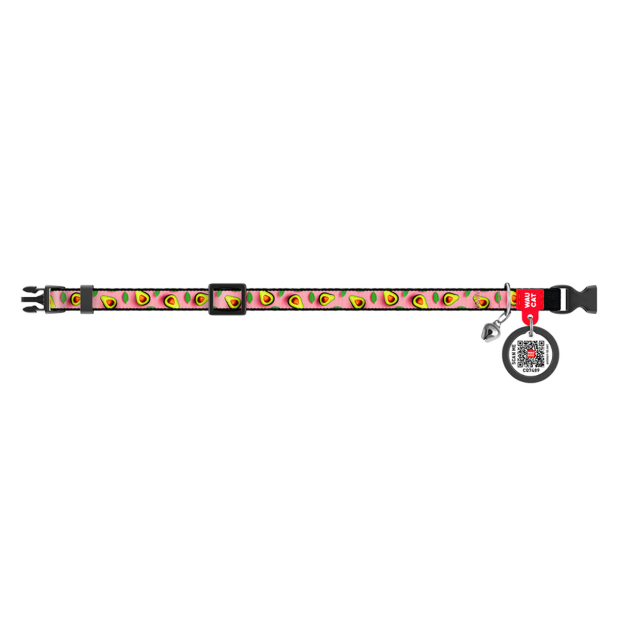 WAUCAT Nylon cat collar with QR passport, "Avocado on pink" design, plastic fastex, XS, W 3/8", L 8"-11"