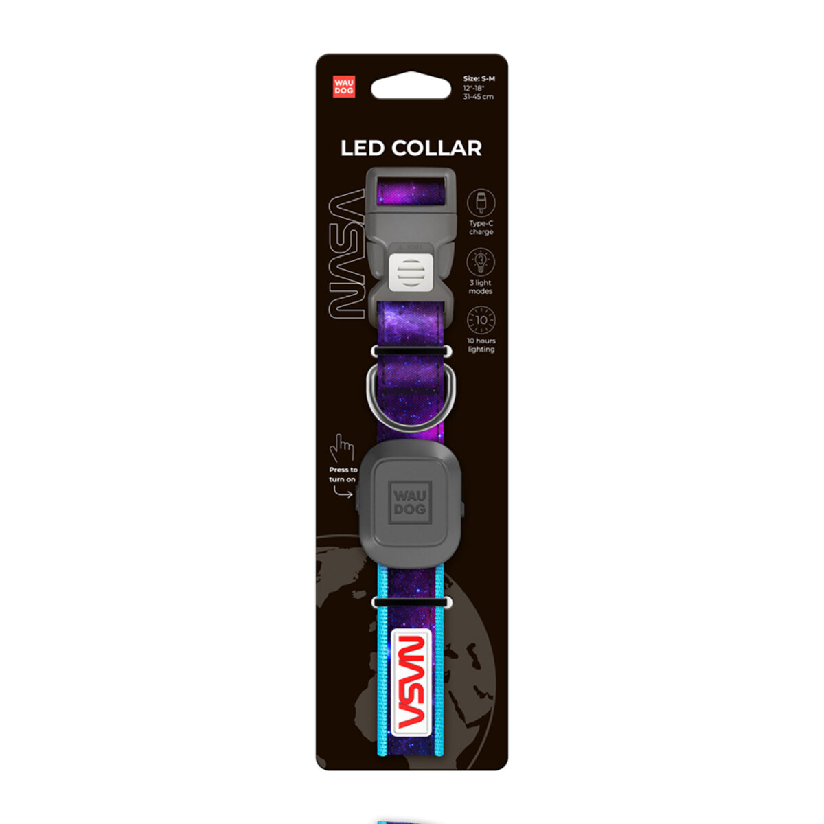 The WAUDOG LED collar is a stylish and functional pet accessory, equipped LED lighting for visibility in the dark. The NASA21 model with adjustable length and a width of 25 mm is suitable for medium and large breeds. It features a built-in battery that provides up to 10 hours of continuous illumination on a single charge. The collar charges via a USB Type-C port, offering convenience and ease of use. It's the perfect choice for active walks at any time of the day.