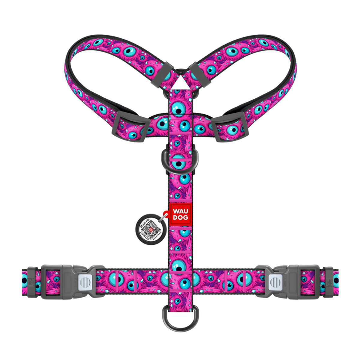 WAUDOG Nylon dog H-harness with QR-passport, "Monster Eye" design, plastic fastex, M, W 0,8", A 15"-23,6", B 18,1"-23,6"