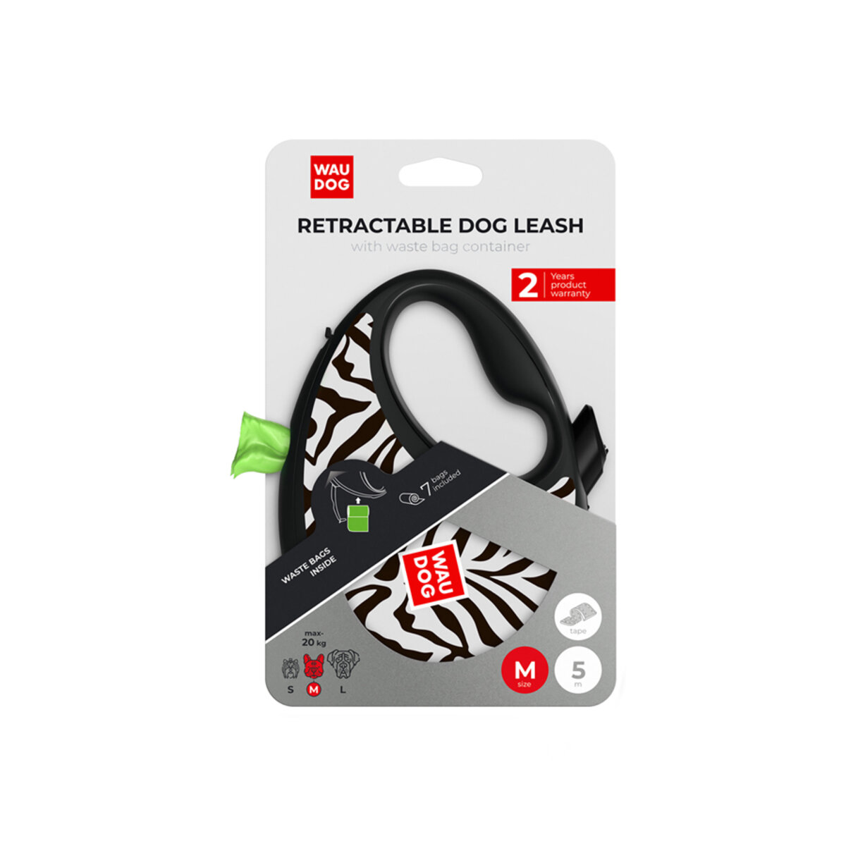 WAUDOG R-leash retractable dog leash with waste bag container, "Zebra" design, reflective tape, M, up to 44 lb 1 oz., 9' 10"