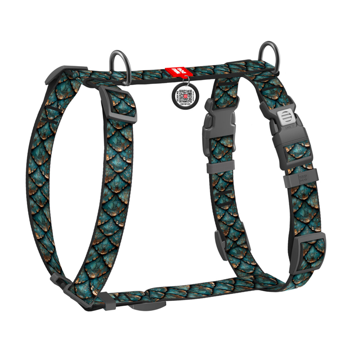 WAUDOG Nylon dog H-harness with QR pet tag, "Scales" design, plastic fastex, М, W 0,8", А 15"-23,6", В 18,1"-23,6"