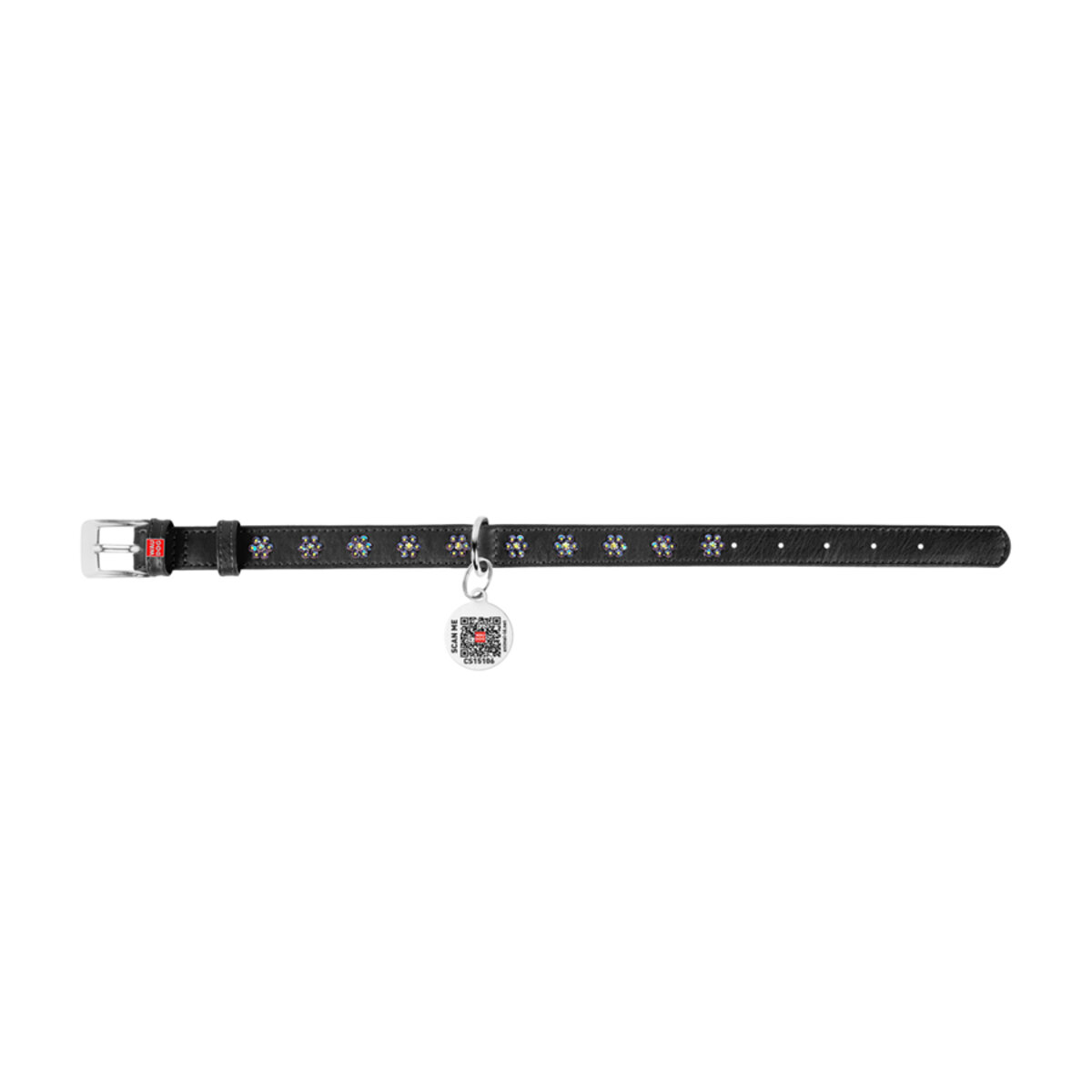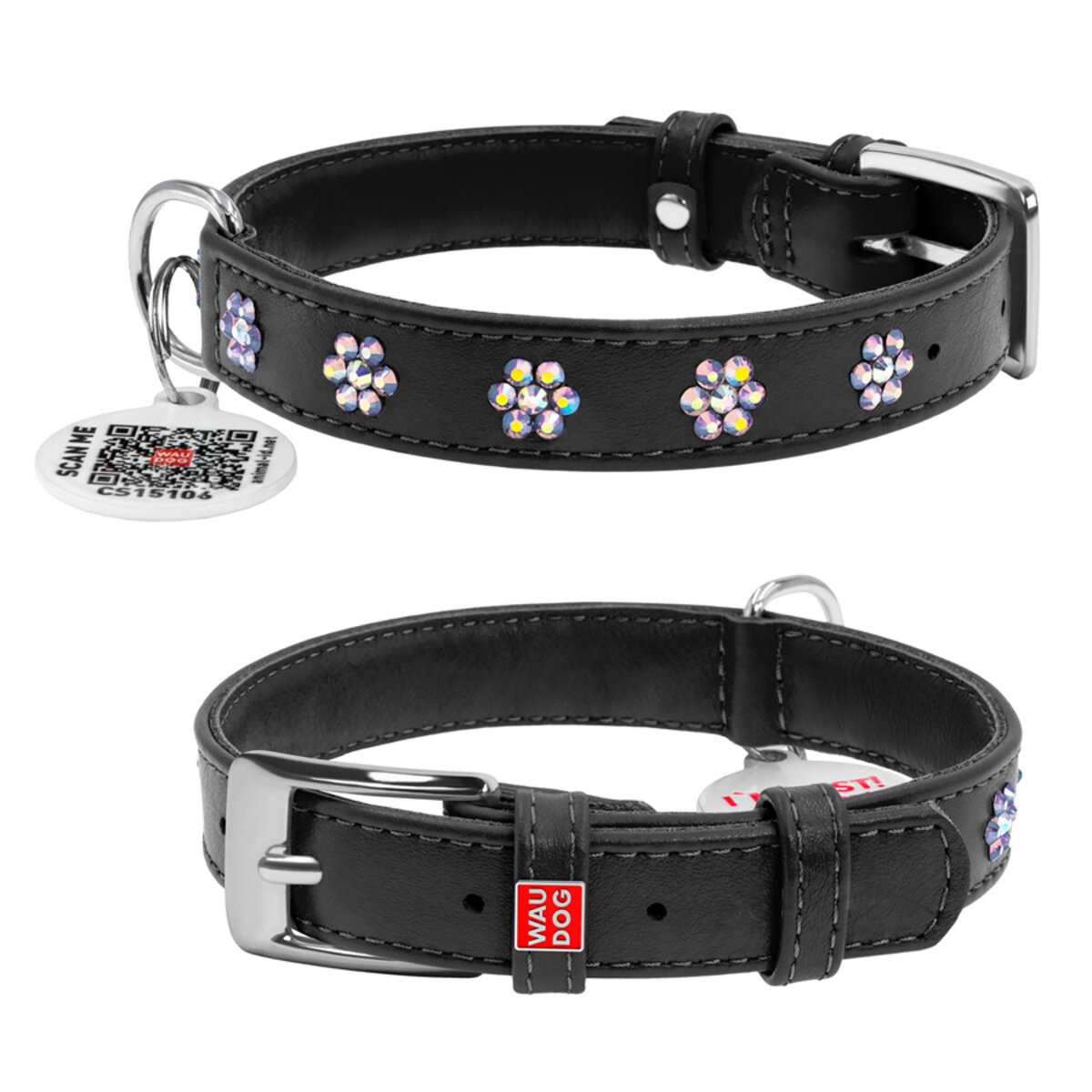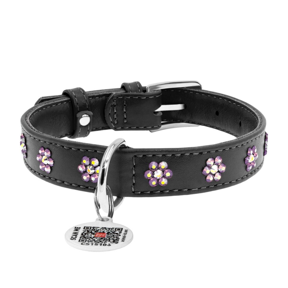 WAUDOG Glamour genuine leather dog collar with QR passport, with glued decorations "Flower", W 0.59", L 11"-14" black