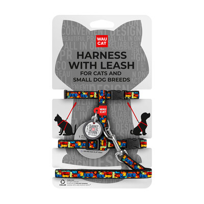 329-4056 WAUCAT Nylon cat and small dog harness with lead with QR passport, "Blocks" design, plastic fastex, XS, W 3/8", B 10"-15" C 8"-11"