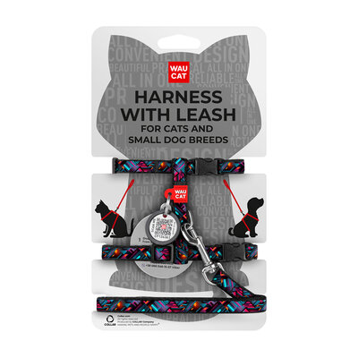 329-4057 WAUCAT Nylon cat and small dog harness with lead with QR passport, "3D Cubes" design, plastic fastex, XS, W 3/8", B 10"-15" C 8"-11"