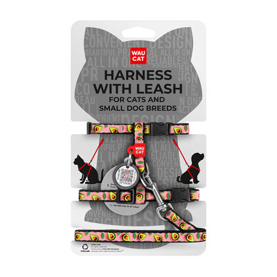 329-4051 WAUCAT Nylon cat and small dog harness with lead with QR passport, "Avocado on pink" design, plastic fastex, XS, W 3/8", B 10"-15" C 8"-11"