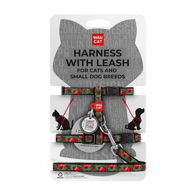 329-4053 WAUCAT Nylon cat and small dog harness with lead with QR passport, "Fig" design, plastic fastex, XS, W 3/8", B 10"-15" C 8"-11"
