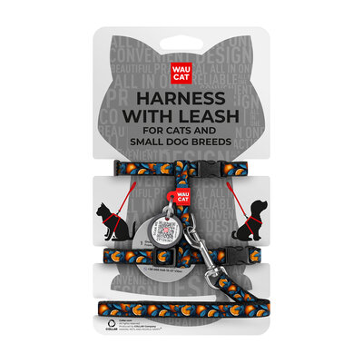 329-4058 WAUCAT Nylon cat and small dog harness with lead with QR passport, "Endless Worlds" design, plastic fastex, XS, W 3/8", B 10"-15" C 8"-11"