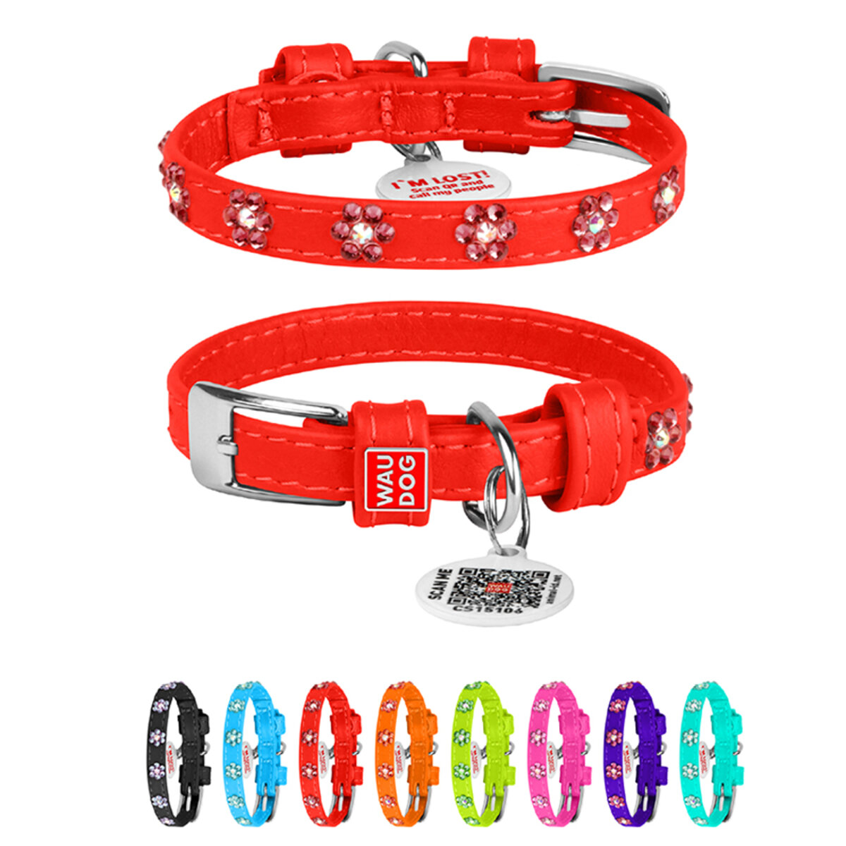 WAUDOG Glamour genuine leather dog collar with QR passport, with glued decorations "Flower", W 0.35", L 7"-8" red