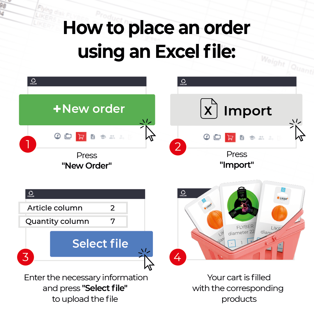 Using the "new order" function, upload an Excel file with a list of products, specify the column number with the article number/EAN code and the column number with the quantity.